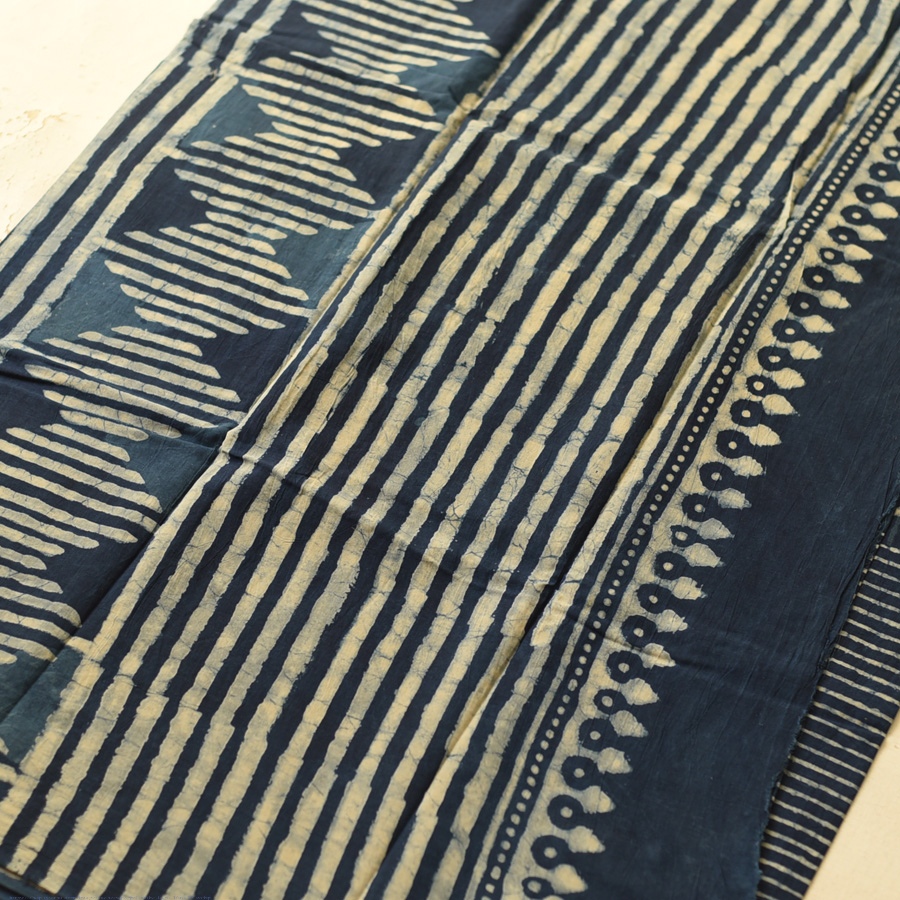 Block printing was practiced in places like Kukshi, Dharampuri and Thikri (Dhar district) by a group of Hindu and Mohammedan printers and dyers; the Chippas (printers) and the Nilgars (dyers). They catered to the clothing needs of the ‘Adivasis’ (native tribes). The patterns were mostly raw and coarse cotton was used. However, the printers and dyers, in their never-ending quest for ideal conditions to hone their craft kept wandering and a group is believed to have settled in the villages of Tarapur and Umedpura of Madhya Pradesh. The two villages are on two side of river Gambhiri. The mineral content of the river water in this region brought out the required richness in the colors. The craft is believed to have existed for over two hundred years here and grown to attain characteristic forms, which made it exclusive to the region.
