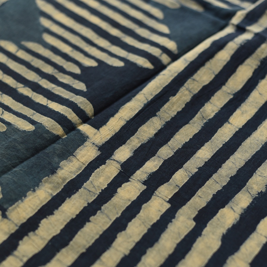 This helps in the color fastening. Next step is to print with mud. The mud printed areas are smeared with wood dust. This also increases the adhesive strength of the Dabu. This is a cold dyeing process where the cloth is dipped in the indigo dye solution.