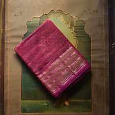 The understated elegance of a Maheshwari sari is complemented by the subtle attributes that make it different. The Maheshwari sari has areversible border, so it can be worn on both sides. It also has a unique pallav with five stripes, two white and three coloured ones, alternating. The sari is usually plain, or has stripes or checks in its field, with geometric motifs decorating the borders. The motifs are usually fine abstract representations of local elements like flowers, leaves, and the local architecture.