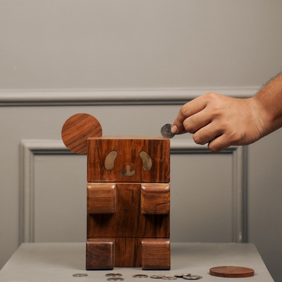 an adorable Wooden Piggy Bank crafted from premium Shesham wood. This charming piggy bank not only adds a touch of whimsy to any space but also serves as a practical Coin & Bills Storage box. Its magnetic feet allow for easy withdrawal of savings, making it convenient for both kids and adults. With dimensions of 13cm in length, 13cm in width, and 20cm in height, and weighing 1100gm, it's the perfect blend of functionality and charm for saving those precious coins and bills. Start saving in style with our Panda-Shaped Wooden Piggy Bank!