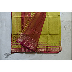 The understated elegance of a Maheshwari sari is complemented by the subtle attributes that make it different. The Maheshwari sari has areversible border, so it can be worn on both sides. It also has a unique pallav with five stripes, two white and three coloured ones, alternating. The sari is usually plain, or has stripes or checks in its field, with geometric motifs decorating the borders. The motifs are usually fine abstract representations of local elements like flowers, leaves, and the local architecture.