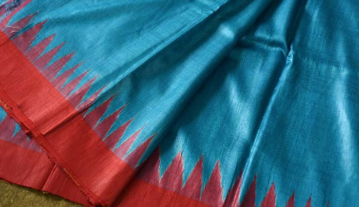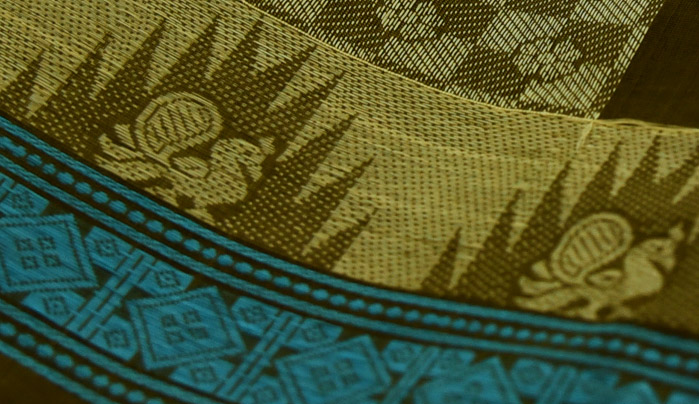 Temple motifs (often triangular tower shapes or gopuram outlines) form the iconic ‘temple border’ on many South Indian sarees. The design recalls temple architecture- stepped, pyramidal towers with niches and is woven along the saree’s edge. This motif signifies sanctity and protection; it is believed to bring divine blessings . In Kanchipuram and other Tamil sarees, temple motifs (yaali, gopuram silhouettes, lotus-towers) are extremely common. Weavers literally took inspiration from nearby shrines: Kanchipuram’s craft is inspired by temple architecture and sculpture, and temple borders became synonymous with auspicious wedding sarees. Temple borders can also be prominently seen in the Dharmavaram Silk Sarees from Andhra Pradesh, The Berhampuri ‘Phoda Kumbha’ silk saree of Odisha is nicknamed the ‘temple weave’. Its hallmark is a kumbha (temple-spire) motif running along the border. Korial sarees from Bengal also feature this border.