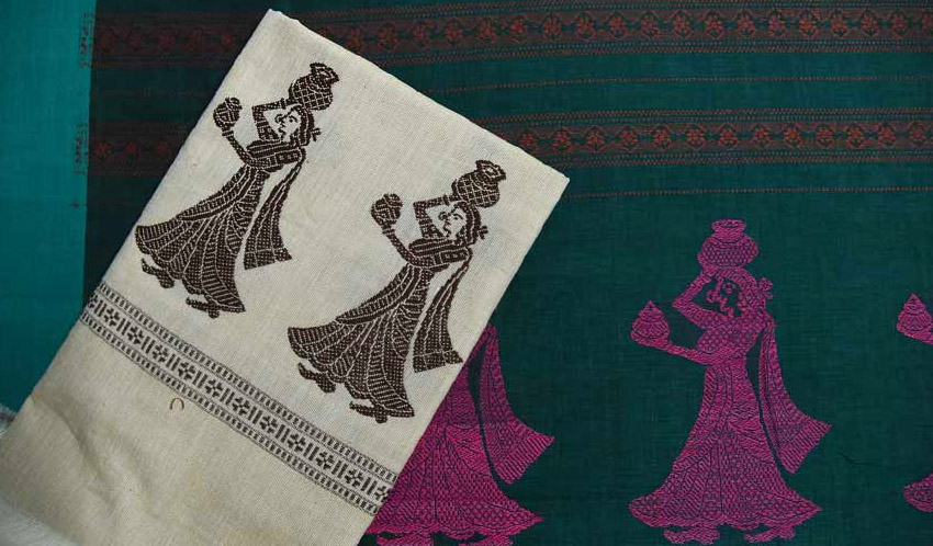 The origin of the Siddipet Gollabhama Saree is said to be Siddipet town in the Siddipet district of Telangana, India. Gollabhama literally translates to “milkmaid woman”. The saree is mainly distinguished by woven figurative motifs depicting stylized female forms carrying pots or engaged in pastoral activity. It developed as a regionally distinctive cotton saree known for narrative motifs integrated into the weave. The weaving tradition is part of the Deccan handloom heritage and has been practiced for several generations in Siddipet. These sarees are traditionally woven on both pit looms and frame looms, using the extra weft technique to create intricate patterns. Particularly these sarees have three different types of designs woven on the fabric namely Kolatam, Bathukamma and Gollabhama with Gollabhama being the most commonly used. The sarees received a Geographical Indication (GI) tag in 2012.
