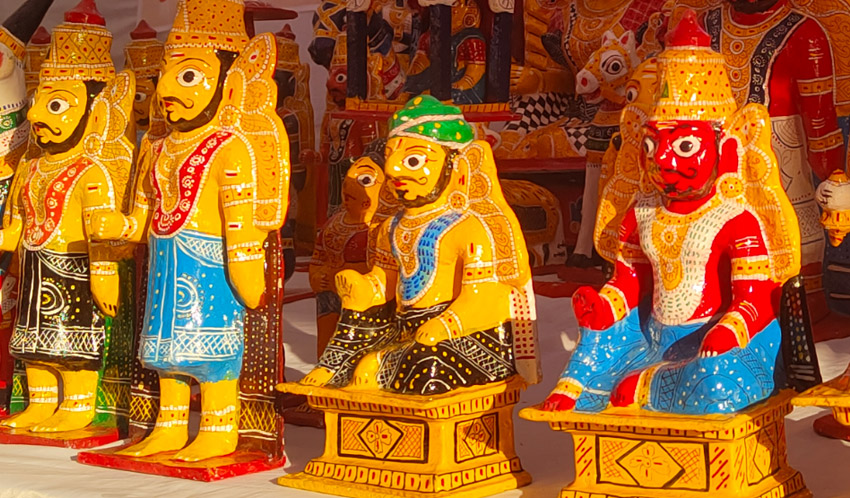 In Telangana, materials drawn from the surrounding environment have played an important role in shaping artistic traditions. Artisans have worked with cotton, silk, metal, lacquer, and natural dyes, transforming them into objects of beauty and utility. Famous craft traditions such as Pochampally Ikat weaving, Nirmal painting and toys, Pembarthi brass work, and Cheriyal scroll painting reflect the region’s rich visual language and storytelling heritage. These forms combine skilled craftsmanship with narrative, symbolism, and regional aesthetics.