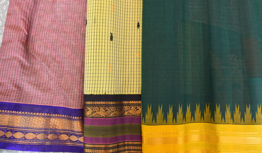 The weaving tradition developed under the patronage of the Gadwal Samsthanam (feudal estate) during the 18th–19th centuries. Historical records and local archives indicate that Gadwal sarees were presented as ceremonial offerings and were associated with temple rituals and courtly attire. The saree is handwoven on pit looms and a defining feature of this saree is the interlocking of a cotton body with silk borders and pallu. The components are woven separately on the loom and joined through a labor-intensive interlocking technique known locally as kuttu (also referred to as kupadam). The join is structural, not stitched. This creates a durable seam capable of withstanding wear. Despite silk borders and zari-rich pallus, the cotton body makes the saree comparatively lightweight. Historically valued for being foldable to a compact size while retaining a rich appearance. Gadwal Sarees were granted GI registration in 2010 under the Geographical Indications of Goods (Registration and Protection) Act, 1999 (India).