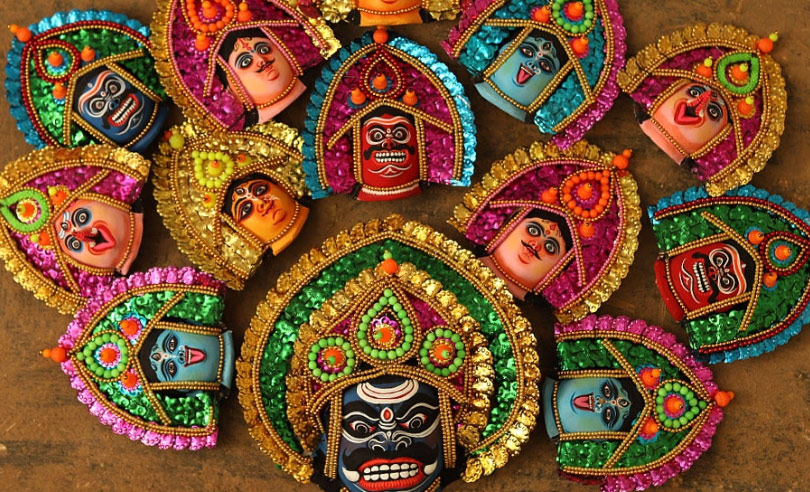 Chhau masks are traditional handcrafted masks used in the Purulia Chhau dance of West Bengal. They are an essential element of this martial-ritual dance form, performed during festivals like Chaitra Parva. The craft is primarily practised in Charida village (Purulia district), known as the mask-makers’ hub. Artisans shape the base using clay moulds layered with paper and cloth. After drying, the mask is sun-hardened, refined, and coated with chalk paste. It is then painted in vivid colours and decorated with foil, feathers, beads, and fabric. Each mask represents specific characters from epics, Puranas, or local folklore. Facial expressions are exaggerated to convey emotion from a distance. The craft is traditionally sustained by artisan families linked to performer communities. Chhau dance itself is recognised by UNESCO as Intangible Cultural Heritage (2010). The Purulia Chhau mask (made in Charida village, Purulia district, West Bengal) was officially registered with a GI tag in 2018, recognising its unique regional craftsmanship and cultural identity. The masks are also sold as decorative objects beyond performance contexts. Today, Charida remains the principal centre where this living craft continues to thrive.