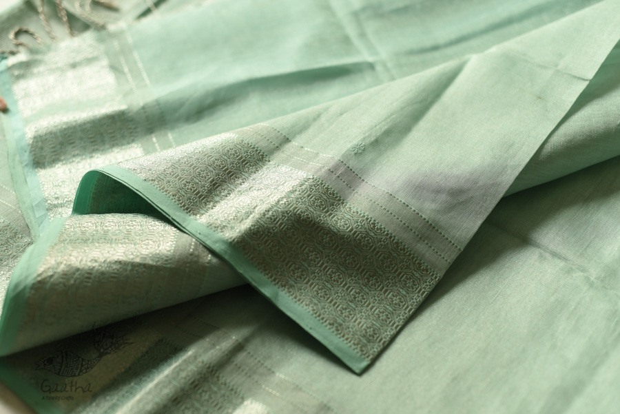 The understated elegance of a Maheshwari sari is complemented by the subtle attributes that make it different. The Maheshwari sari has areversible border, so it can be worn on both sides. It also has a unique pallav with five stripes, two white and three coloured ones, alternating. The sari is usually plain, or has stripes or checks in its field, with geometric motifs decorating the borders. The motifs are usually fine abstract representations of local elements like flowers, leaves, and the local architecture.