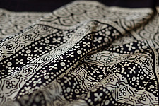 The cloth was treated with Harda, which functions as a pre-mordant link between the fibers and the various other ingredients. It left a yellowish tinge to the fabric, hence known as ‘pila-karna'. The craftsman then printed the black area of the design using the Syahi (ink) pinting paste prepared using scrap iron, horseshoes and Gur (jaggery) in an earthenware vessel. After the black outline was made, the craftsman made the Begar, a mordant used for red. Alum was mixed with sticky tree gum paste and a pinch of Geru red ochre to bring out colour in the otherwise transparent paste. The begar paste was then applied using a 'Datta' block to fill in the 'Rekh' (the outlining block) and the fabric was dried for a week.