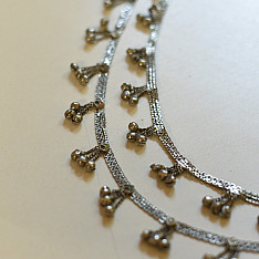 Chased faces of animals like elephant and tiger make the most popular endings for the rings. The plates are cut to get the desired outline of the pendant and impressions of the motifs are transferred onto them using hammers and dies. These pendants and ‘ghungroos’ are then attached to each other and to the main metal rod using linkages made of the wire. The process of finishing these ornaments brings out the real luster of the metal and is usually done with acid. The same ornaments are also made in white metal today.